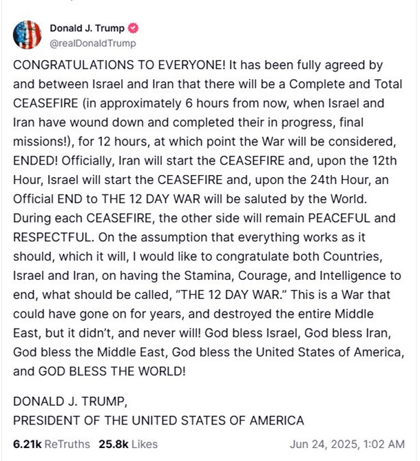 “Офіційно Іран розпочне припинення вогню, а на 12-ту годину Ізраїль розпочне припинення вогню, а на 24-ту годину світ вітатиме офіційне завершення 12-денної війни. Під час кожного припинення вогню інша сторона залишатиметься мирною та шанобливою”, – додав Трамп.