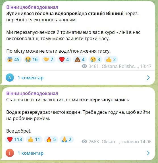 Пізніше стало відомо, що у Вінниці виникли проблеми із водопостачанням. Причина – зупинилась головна водопровідна станція міста через перебої з електропостачанням.